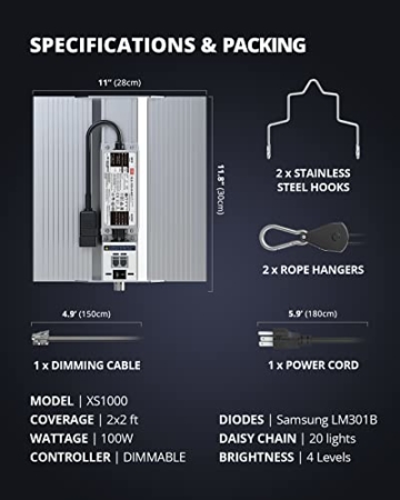 Die Viparspectra XS1500 PRO Upgrade 2023 verfügt über eine beeindruckende Leistung von 150W, die von den leistungsstarken LEDs erzeugt wird. Mit dieser Leistung kann die Lampe problemlos bis zu 60x60cm große Anbauflächen ausleuchten, was sie ideal für den Einsatz in kleineren Growboxen oder Growscränke macht. Die LEDs sind außerdem extrem effizient und erzeugen ein optimales Lichtspektrum, das sich ideal für das Pflanzenwachstum eignet.